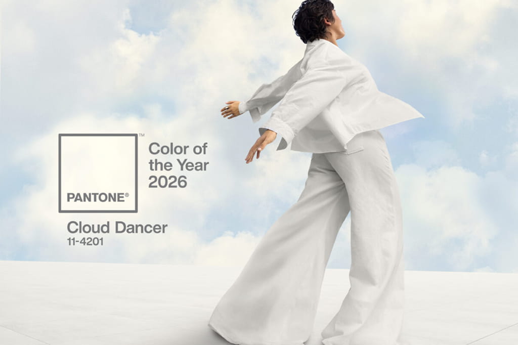 Para 2026, a cor escolhida foi Cloud Dancer, um branco suave, leve e etéreo, que simboliza clareza, pausa e presença consciente em um mundo cada vez mais acelerado e visualmente saturado.